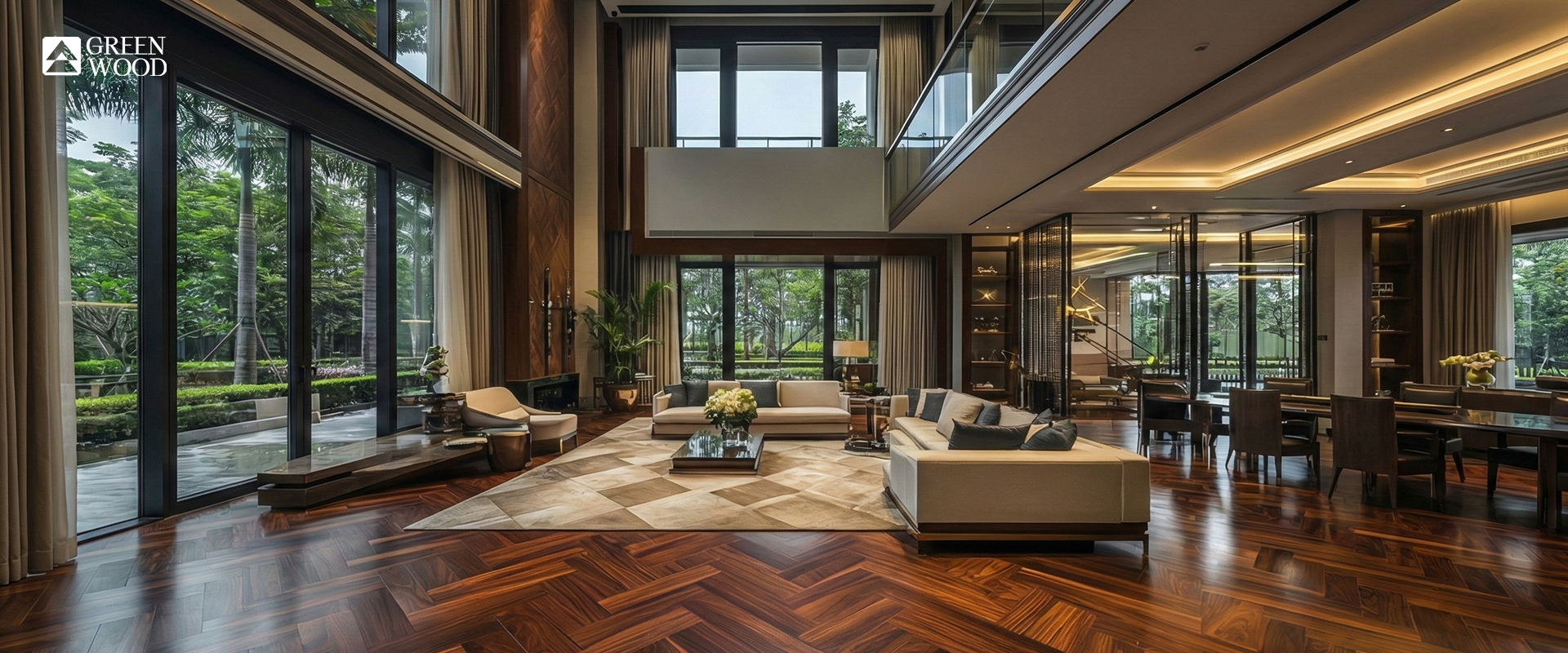 Luxury parquet flooring refers to high-quality wood or wood-look materials arranged in refined geometric or wide-plank patterns. The emphasis is on: