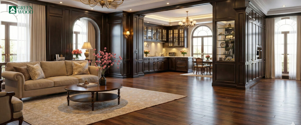Solid wood offers the richest feel; engineered parquet provides better stability for Dubai’s environment.