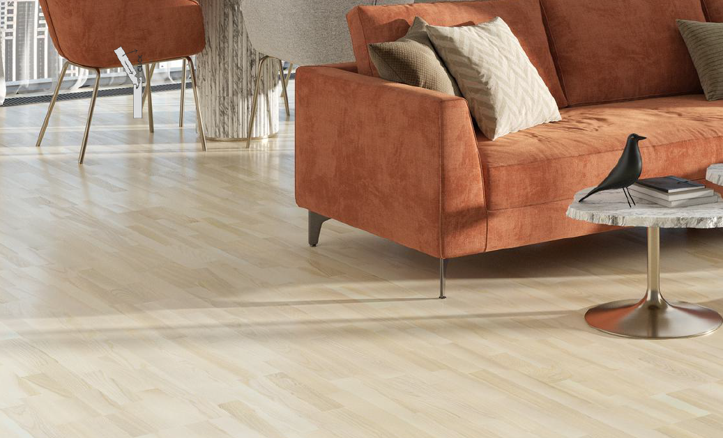 Made from genuine ash wood, the flooring showcases the species’ characteristic grain structure—refined, elegant, and naturally expressive. The white-toned finish brightens the wood while keeping its organic character visible.